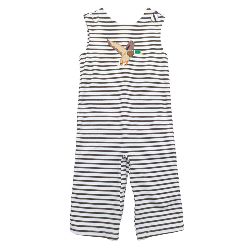 Made from soft, breathable cotton, the Jack Longall Mallard Romper showcases a charming mallard appliqué over a classic striped pattern. Designed for superior comfort and effortless sibling coordination, it pairs perfectly with our big brother two-piece Mallard pant set. Wear it alone or layer with our Hart Onesie for extra coziness. Snaps at the seat allow for quick and easy diaper changes.