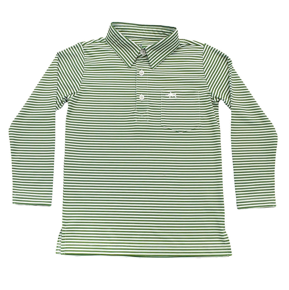 The Saltwater Boys Inshore Performance Polo in Long Sleeve Green Stripe is the ultimate fall essential for every active little boy. Crafted from ultra-soft, moisture-wicking performance fabric, this polo keeps him cool and comfortable even on the busiest, sunniest days.